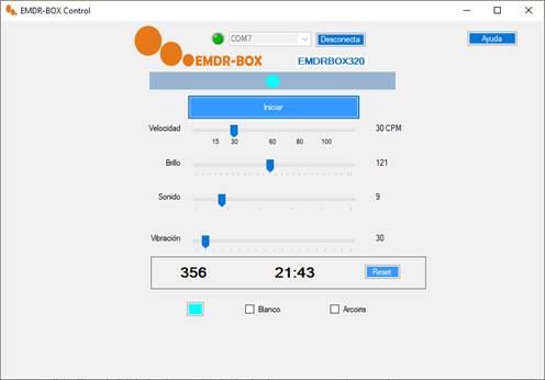 Todos los estímulos son configurables desde el software EMDR-BOX Control, pudiendo conectarse o desconectarse a voluntad según las necesidades de la sesión.